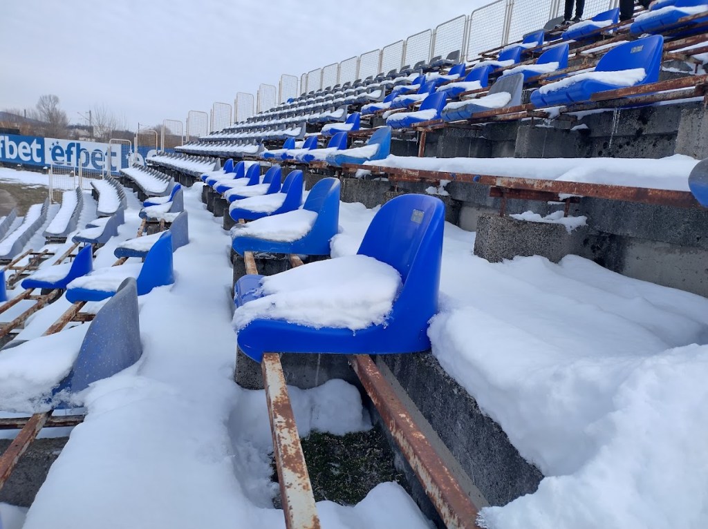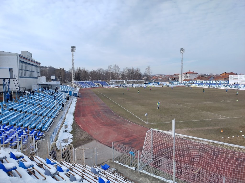 Der Ground selbst ist eine Zusammensetzung aus zwei Beton- und diversen freistehenden und mit blauen Sitzschalen versehenen Tribünenan- und -aufbauten, die in Summe ein Fassungsvermögen von 8.000 Plätzen ergeben, was fürs Mittelfeld der zweitklassigen Vtora Liga reicht. Wie üblich prangt auf allen Banden der immerhin jeweils in den Farben des heimischen Klubs gehaltene Schriftzug des in Bulgarien allgegenwärtigen Wettanbieters efbet, dem Hauptsponsor der ersten beiden Ligen. Der viele, hier im Gegensatz zu den im Laufe des Tages durchfahrenen Gebieten, noch liegende Schnee und die Anzeigetafel in bestem Ostblock-Style runden den optischen Eindruck ab.