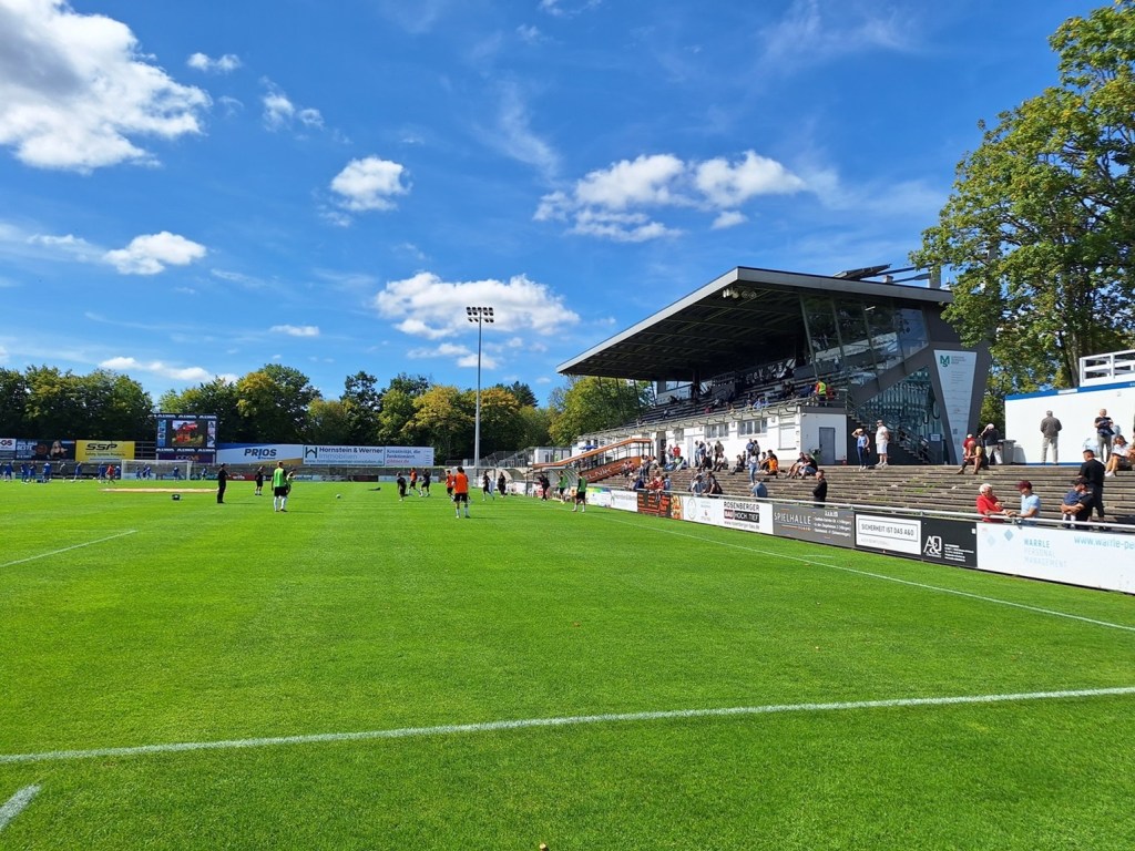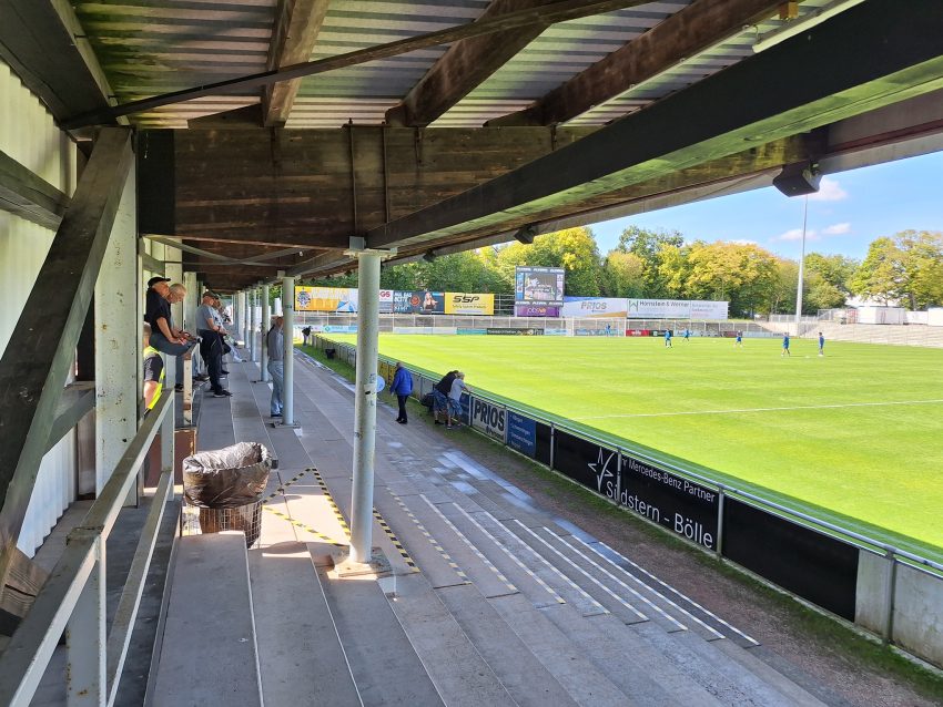 Und einmal oben, im Profigeschäft, gewesen, bleiben die Preise hoch. Die Gastgeber nehmen im Oberliga-Vergleich stolze 11,- EUR Eintritt für den Steher, wer im „Oberrang“ auf der Haupttribüne Platz nehmen möchte, darf gar 16,- EUR löhnen. Auf dem Wecken landet hier regionstypisch keine klassische Bratwurst, sondern eine „Heiße“, die aber über den Grill geht. Geschmacklich passabel, aber kein Highlight. Die nicht-alkoholische Auswahl ist gut, das 0,4er Bier für 4,- bundesligareif bepreist.