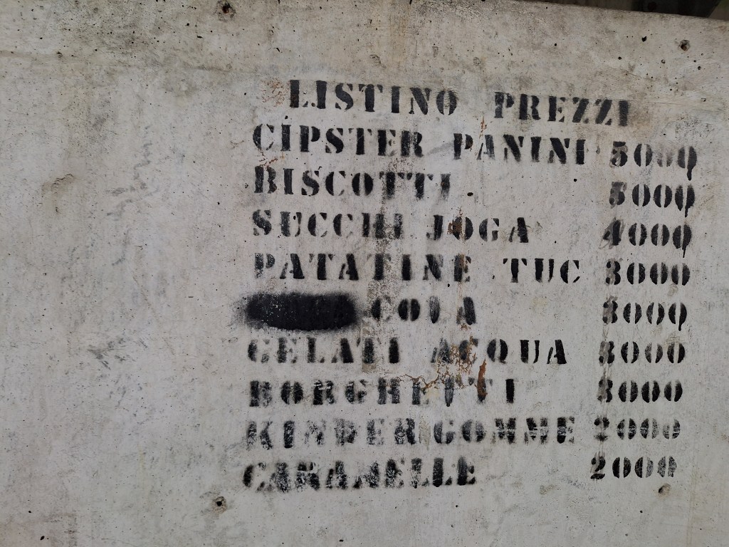 Im Stadioninnern angekommen begeistern vor allem die mächtigen Betonsäulen, die regelrecht an massiv befestigte Schützentürme erinnern. Auf verschiedene Ebene aufgeteilt beherbergen sie auch die Stadionbar, wo man einen wieder mal hervorragenden Espresso Macchiato für schlanke 1,50 Euro kriegt. Beim Bier ist man da schon sportlicher unterwegs, das kleine Bud für 6 Euro schlägt sogar den 0,75l-Becher Moretti, den wir bereits vor dem Stadion für einen Zehner erstehen. Wehmütig wird einem beim Anblick der alten Preistafel, die, in die Betonwände neben den Treppenaufgängen eingraviert, das Snackangebot längst vergangener Fussballepochen konserviert. In Lira versteht sich.