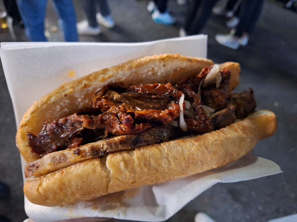 Wieder draußen überkommt uns eine Mischung aus Entdeckungs- und Heißhunger. Wir gönnen uns jeder zwei der fantastischen Panini, die wahlweise mit verschieden zubereitetem Fleisch und ergänzend bis zu zwei Sorten Grillgemüse gereicht werden. Bei mir gibt’s einmal das klassische Salamello mit Zwiebeln und in Runde zwei dann Schweinefilet, getrockneten Tomaten und Auberginen. Mein Begleiter wagt sich unter anderem an die Salsiccia ‚Nduja und klagt den Rest des noch länger als erhofft werdenden Abends über einen feurigen Atem.